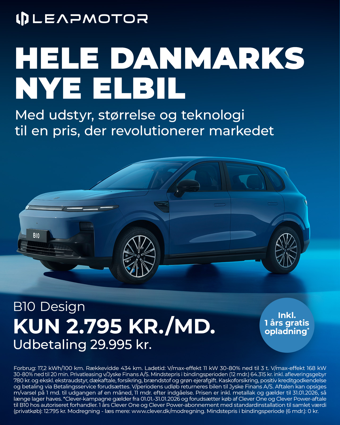 *Clever-kampagne gælder fra 01.01.-31.01.2026 og forudsætter køb af Clever One og Clever Power-aftale til B10 hos autoriseret forhandler. 1 års Clever One og Clever Power-abonnement med standardinstallation til samlet værdi (privatkøb): 12.795,-. Modregning – Læs mere: www.clever.dk/modregning. Mindstepris i bindingsperiode (6 mdr.): 0,-.