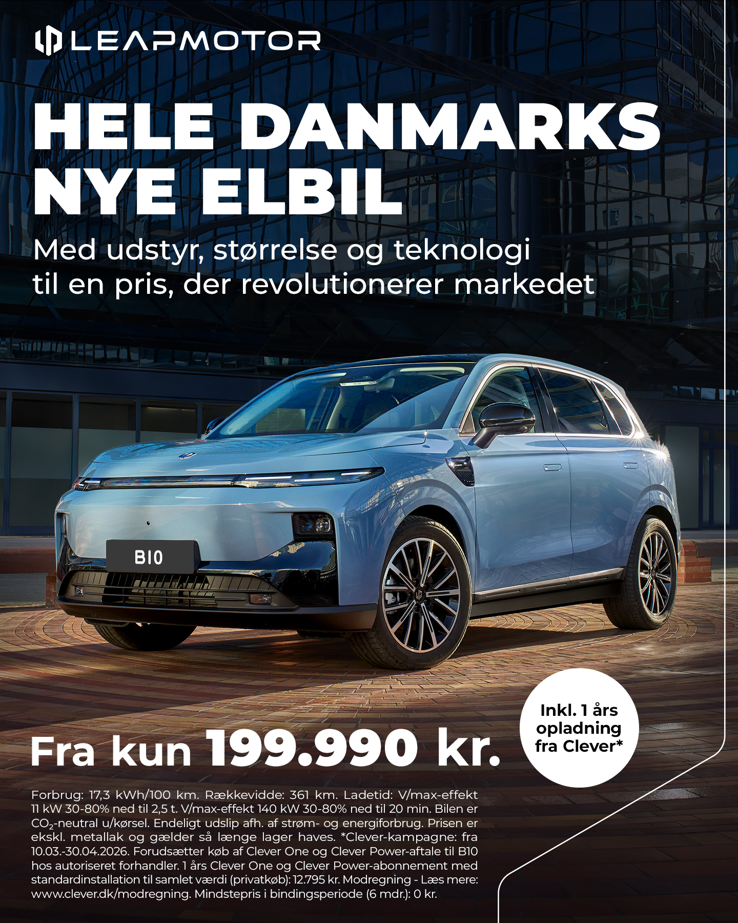 Clever-kampagne: Fra 30.03.-30.04.2026. Forudsætter køb af Clever One og Clever Power-aftale ved køb af en elektrisk LEAPMTOR personbil hos autoriseret forhandler. 1 års Clever One og Clever Power-abonnement med standardinstallation til samlet værdi (privatkøb): 12.795 kr. Modregning – Læs mere: www.clever.dk/modregning. Mindstepris i bindingsperiode (6 mdr): 0 kr.